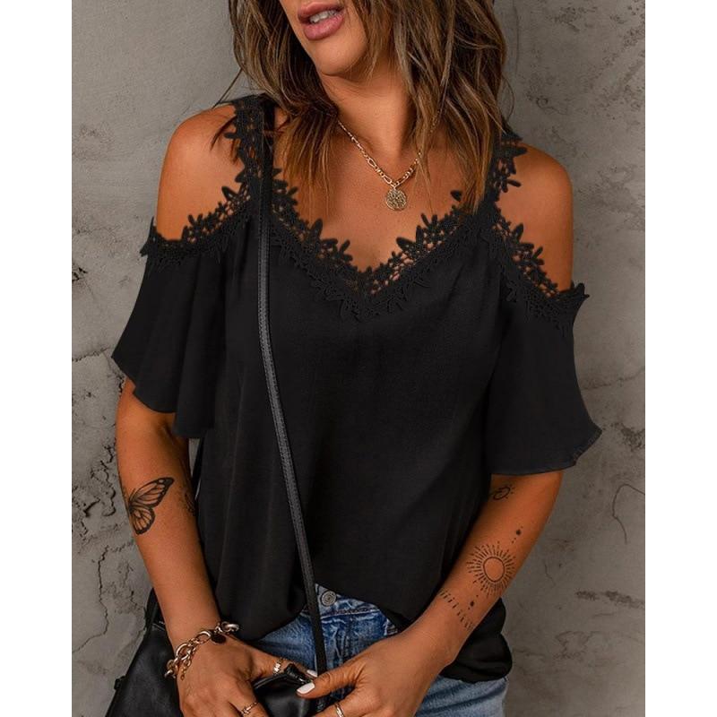 Элегантные женские футболки с V-образным вырезом, сексуальные кружевные, летние белые футболки с коротким рукавом, футболка с открытыми плечами 2023 года, модные однотонные женские топы 26353 L чёрный