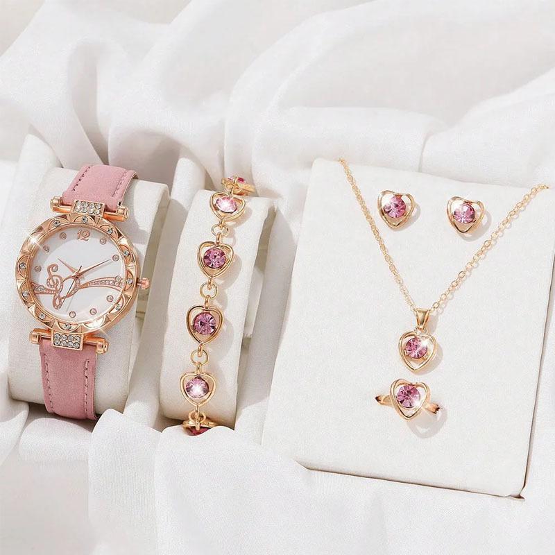 Элегантные женские часы Набор из 6 предметов Кольцо в виде сердца Ожерелье Серьги Браслет Набор ПУ ремешок Женские кварцевые часы розовый