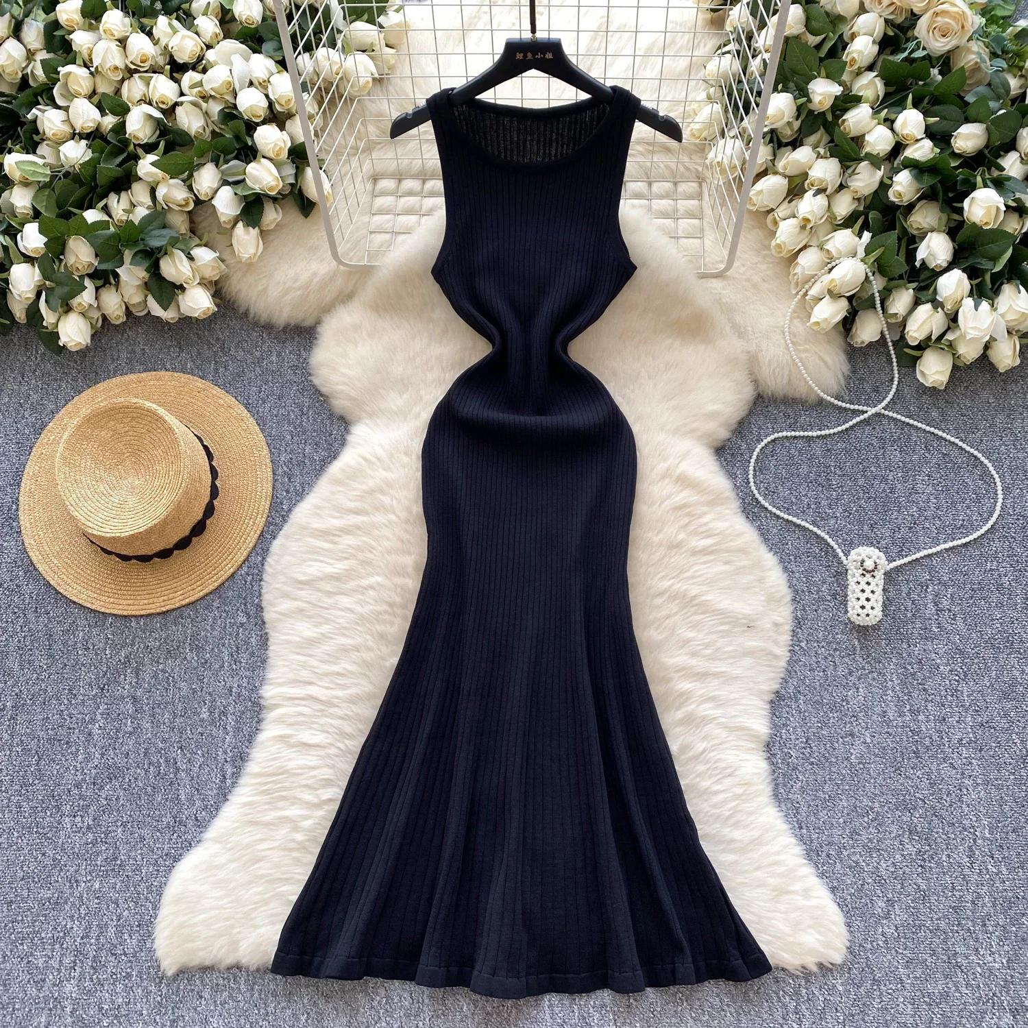 Элегантный французский О-образный вырез, винтажное без рукавов, полосатый шик, трикотаж, облегающее длинное платье-труба, одежда для отдыха на улице One Size чёрный