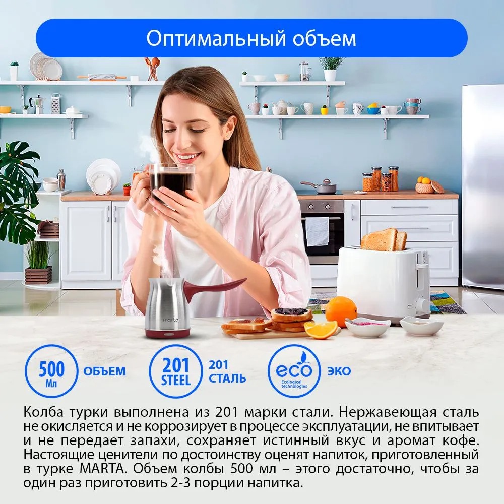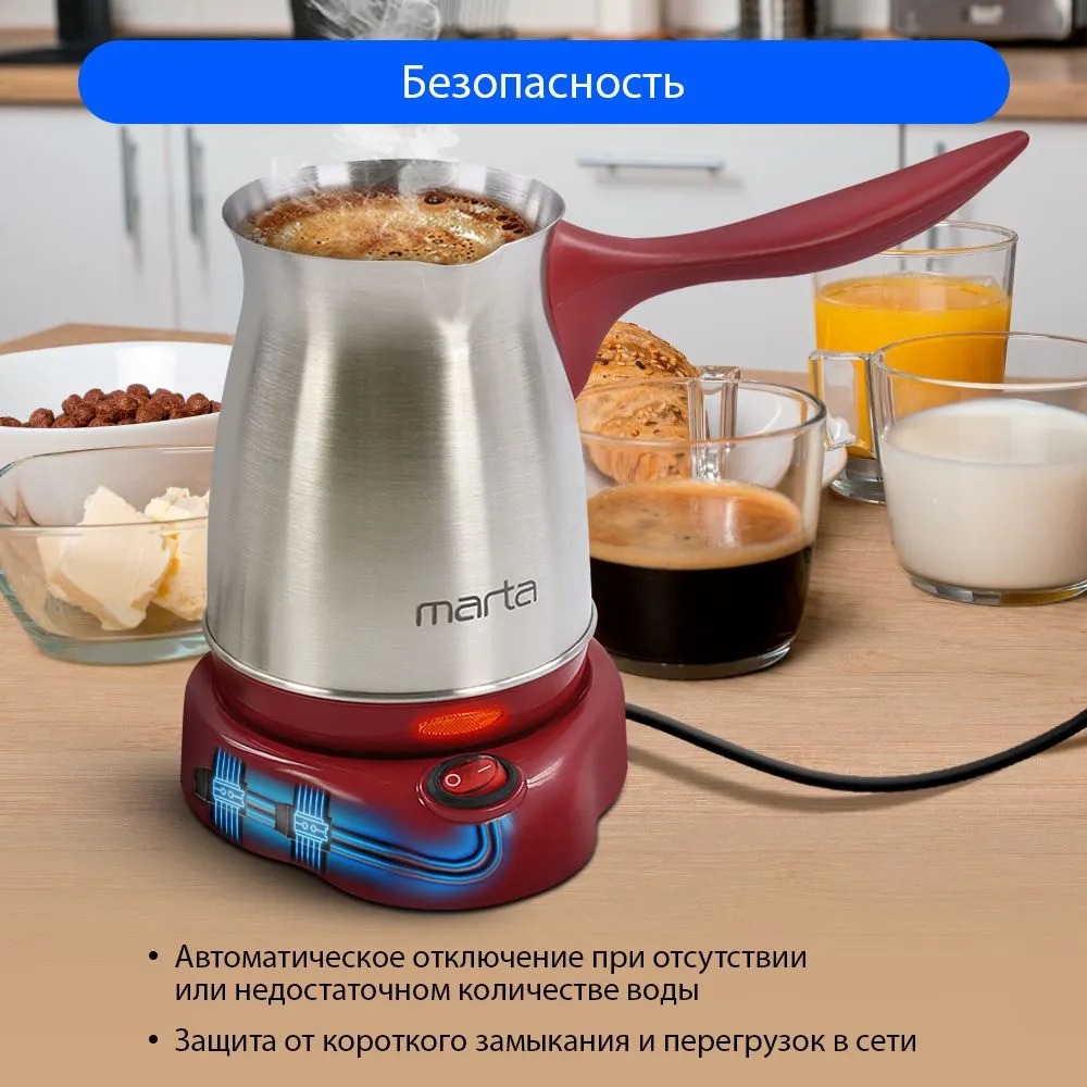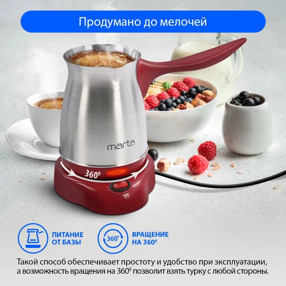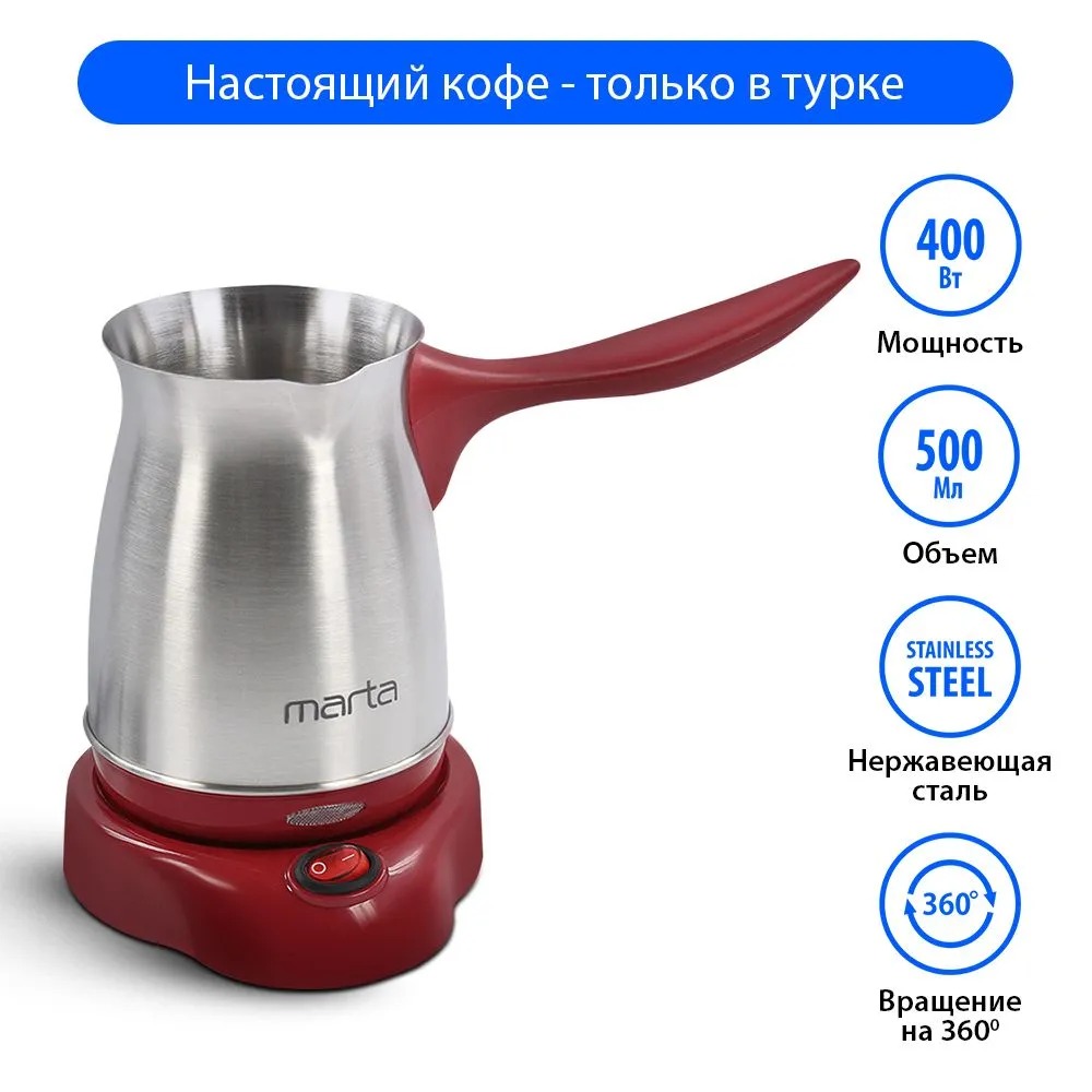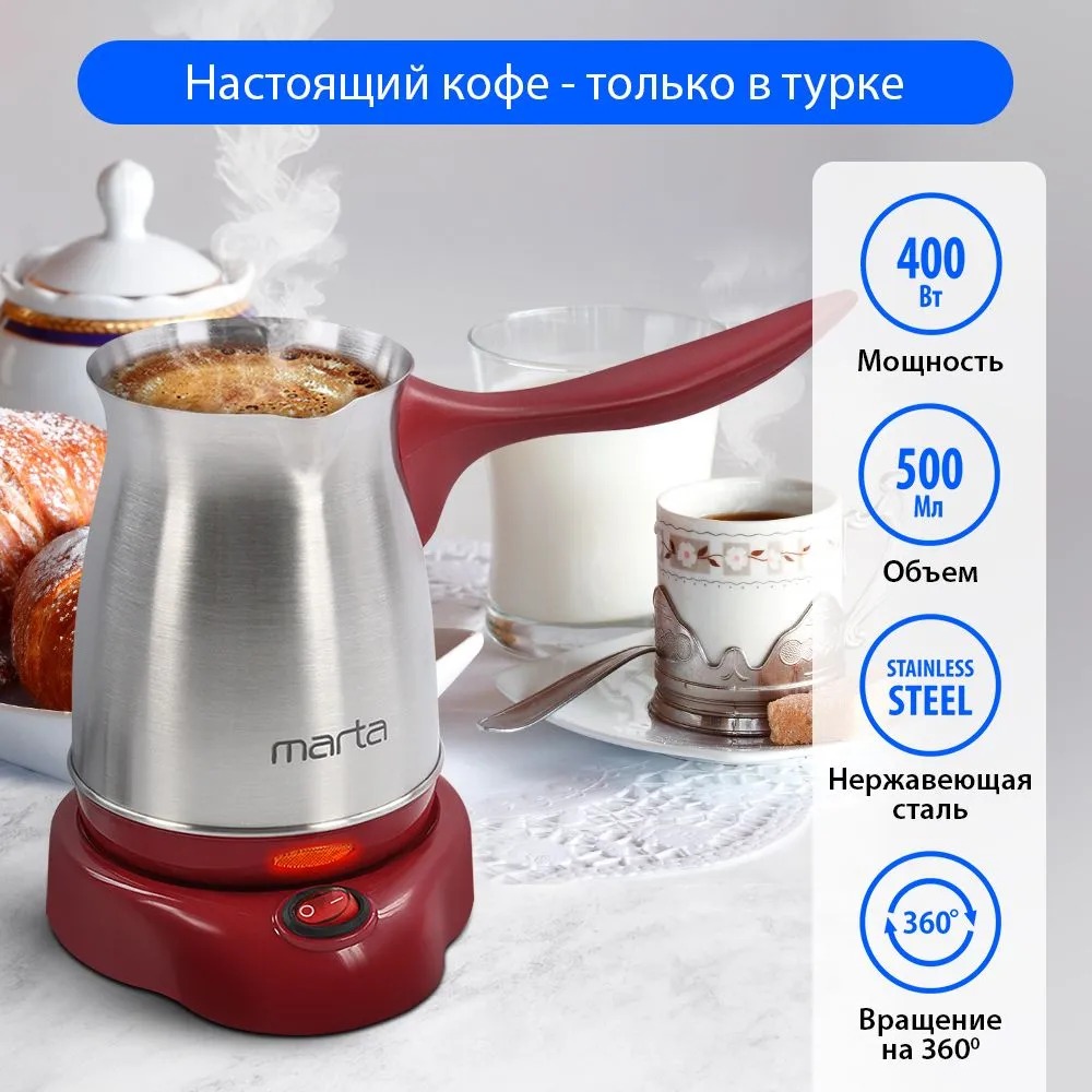 Электрическая турка MARTA MT-2141 БОРДОВЫЙ ГРАНАТ 400 Вт объем 500 мл корпус сталь