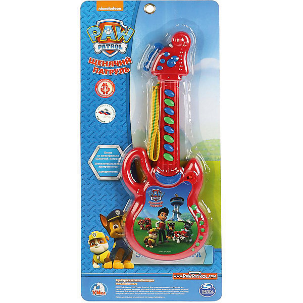 Электрогитара имеет 8 основных кнопок, при нажатии на которые звучит песня из популярного мультсериала «Щенячий патруль», звуки музыкальных инструментов и аплодисменты. Корпус украшен рисунком с главными героями и оснащен удобным ремешком. Игрушка развивает артистизм и слуховое восприятие, мелкую моторику, внимание, речь и память.
