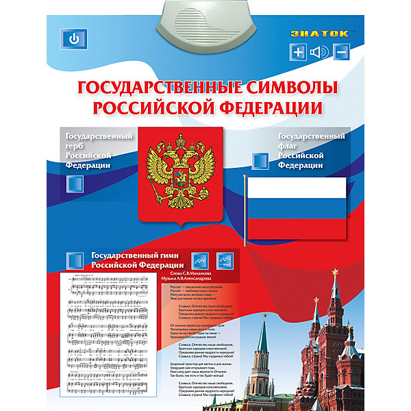 Электронный плакат Znatok «Государственные символы» подходит для размещения на стене дома или в образовательном учреждении. Плакат изображает герб и флаг России, рассказывает историю их появления, а также воспроизводит гимн государства. Поверхность плаката устойчива к влаге. Громкость регулируется.
