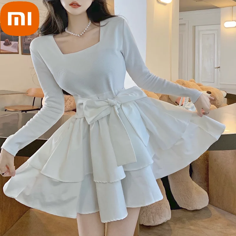 Зимнее милое Плиссированное мини-платье Xiaomi, женское однотонное приталенное милое вечернее платье, женская одежда, корейское дизайнерское ...