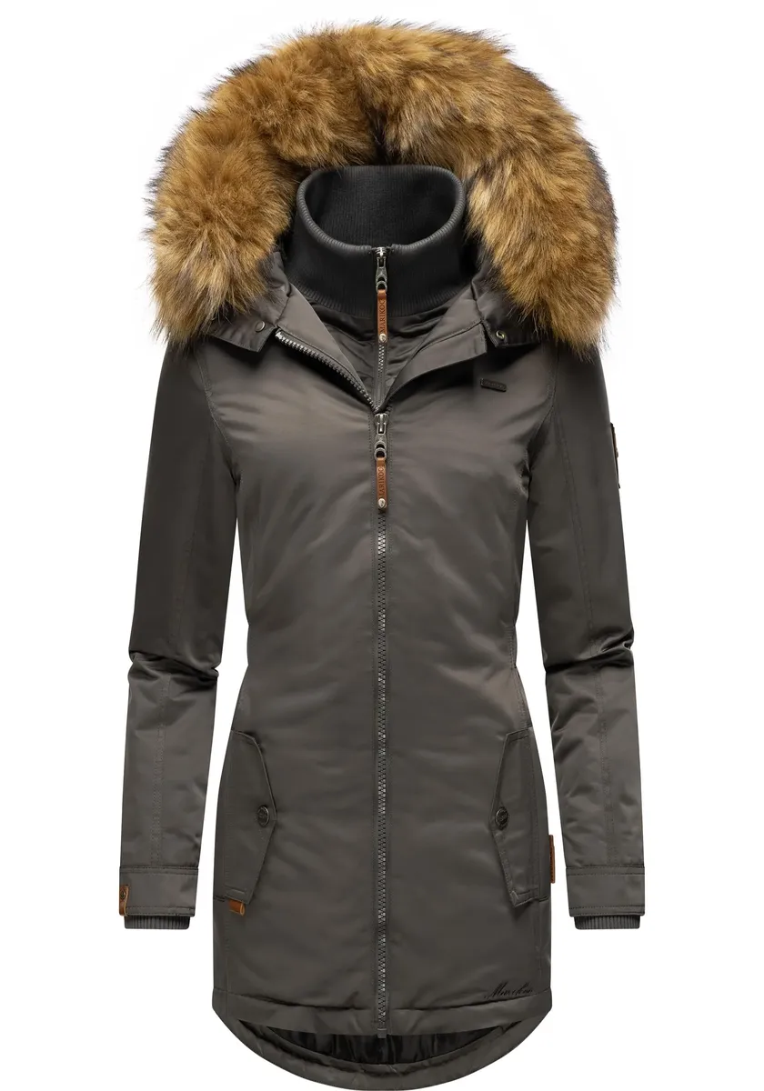 Зимнее пальто Marikoo "Sanakoo", шикарное женское полупальто с капюшоном из искусственного меха, антрацит, Черный, Зимнее пальто Marikoo "Sanakoo", шикарное женское полупальто с капюшоном из искусственного меха, антрацит