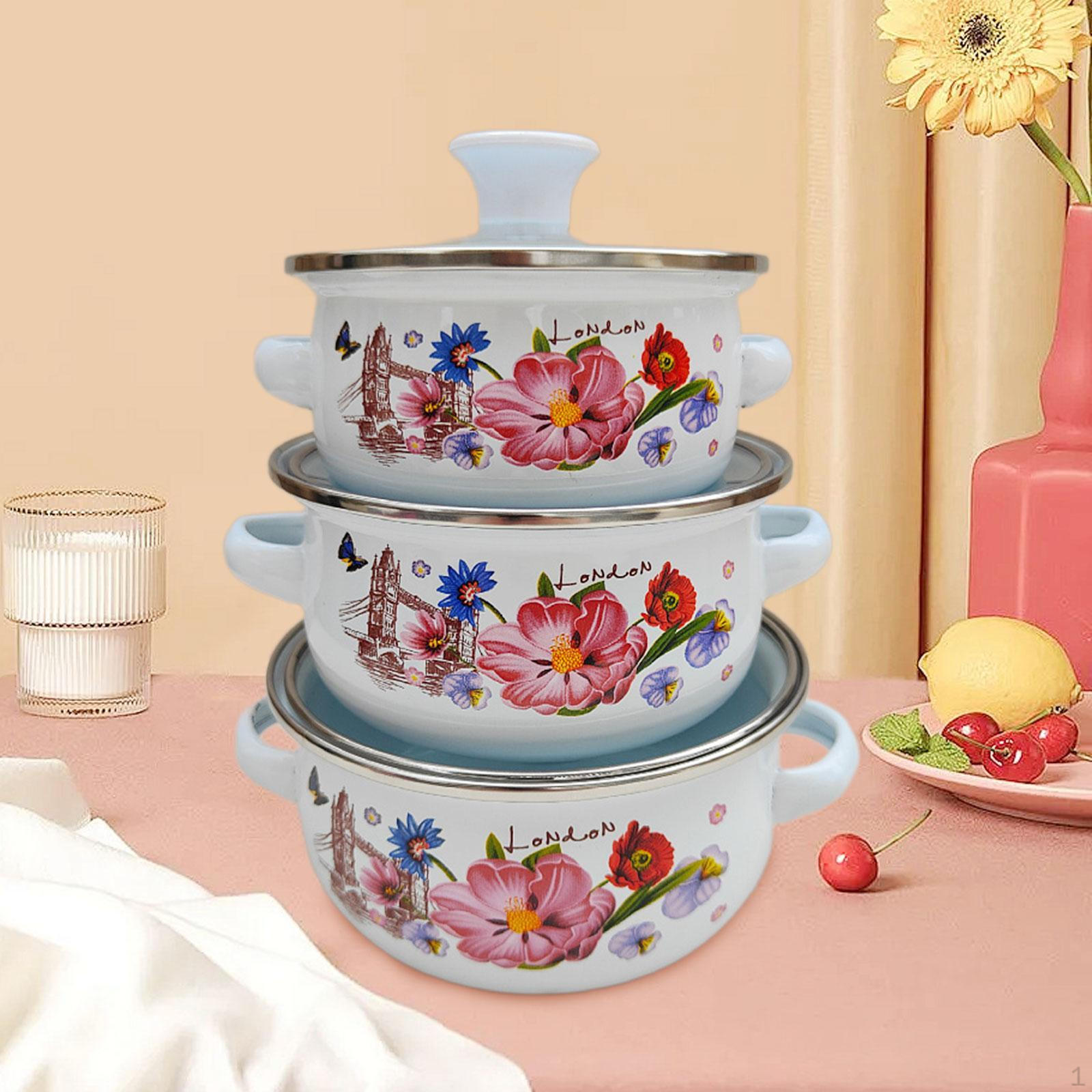 Эмалированная кастрюля из 3 предметов, цветочный дизайн и ручки, для тушения фасоли, глубокого супа C