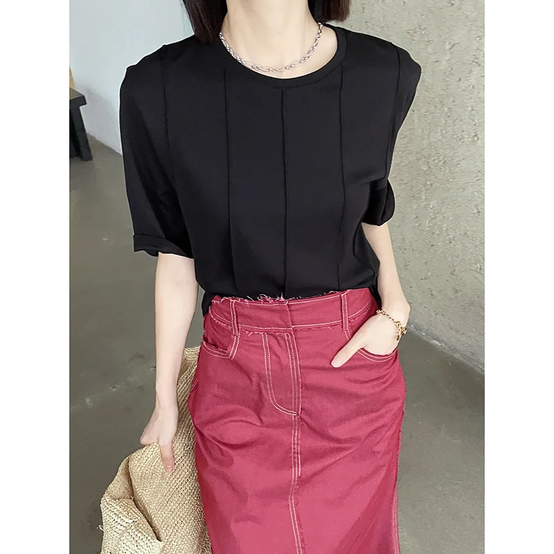 2022 Women's Tops Solid Color Casual 100% Cotton Summer Round Neck Short Sleeves grey