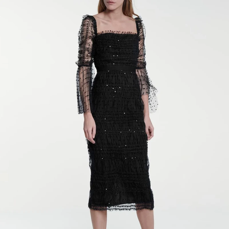 Женское длинное платье в горошек, сексуальное черно-белое облегающее платье с квадратным вырезом и расклешенным длинным рукавом, 2020