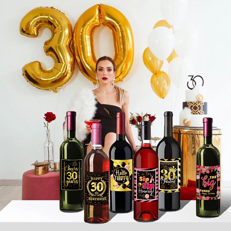 Этикетки для винных бутылок, праздничные ярлыки розового, черного и золотого цвета для празднования дня рождения, праздника, 6 шт., 30, 40, 50, 60 лет