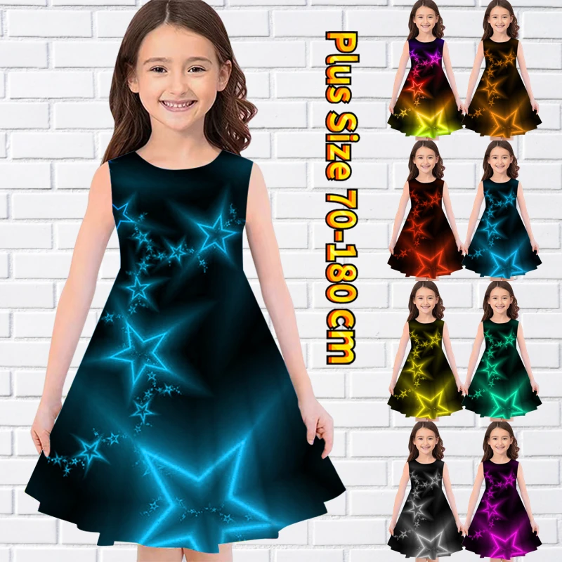 Юбка до колен для маленьких девочек, повседневная Милая юбка с 3D-принтом звезд и круглым вырезом, летнее платье без рукавов, свободное платье принцессы размера 2022