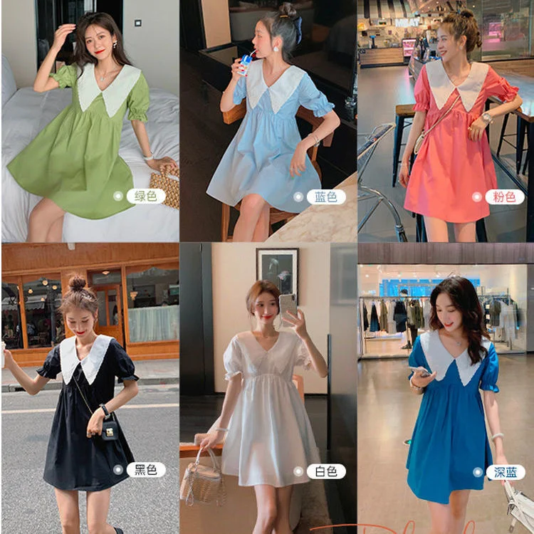Women Summer Short Sleeve Blue Elegant A-line Dress Ladys Vintage Ruffle Print Peter Pan Collar Dress Sweet Beach Vestido