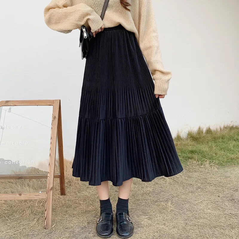 Юбка-миди Женская Плиссированная, трапециевидная, черная, на резинке, осень