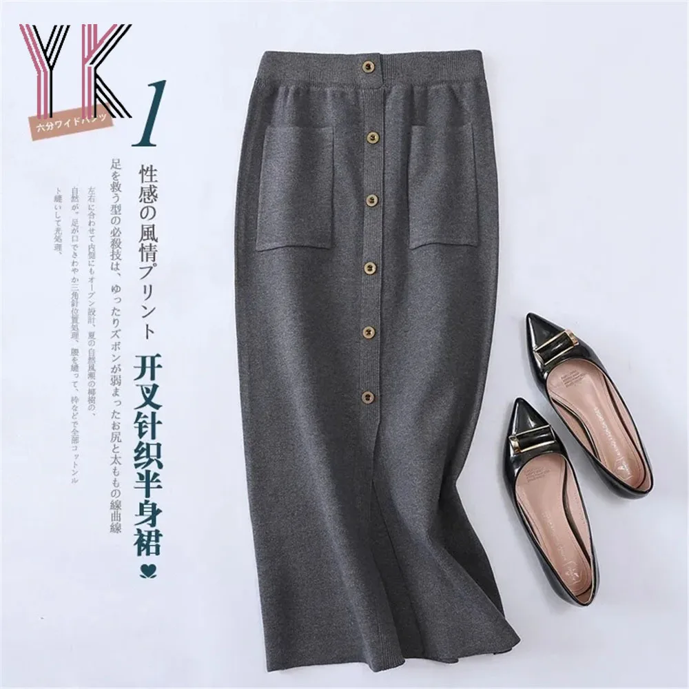 Юбка-миди трикотажная однобортная с карманами, эластичным поясом и высокой талией