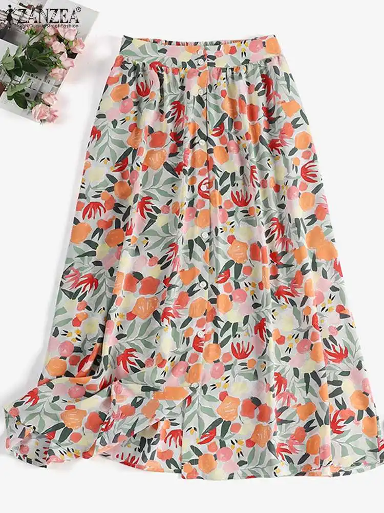 Юбка ZANZEA женская с завышенной талией, модная повседневная юбка-трапеция с цветочным принтом, в богемном стиле, на пуговицах, средней длины, лето 2023