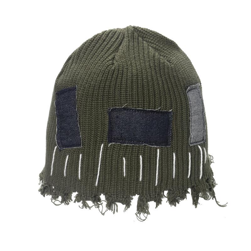 Японская индивидуальность старая заплатка дыра шляпа нищего мужчины и женщины осень и зима интернет-знаменитость трендовый бренд теплая защита ушей тканевая вязаная шапка M(56-58cm) армия зеленый