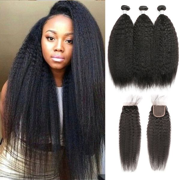 гху перуанский волос пучки с закрытие kinky straight virgin человеческих волос пучки с закрытие яки straight 3 пачки с 4x4 lace closure, Black;brown