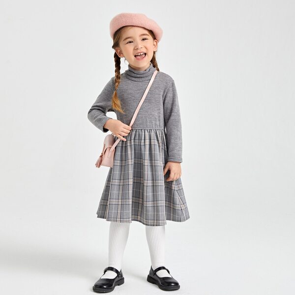 Серый Повседневный Длинный рукав Акрил Клетка футболка Легкий Эластичный Весна / Осень Платья для девочек, size features are:Bust: ,Length: миди ,Sleeve Length:Длинный рукав