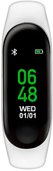 Фитнес браслет. Отображение времени. Будильник. Bluetooth. Сообщения. Входящие звонки. Активности. Счетчик шагов. Трекер сна. Функция поиска телефона. Удаленная камера. Сенсорный экран. Корпус выполнен из пластика черного цвета. Размер корпуса 15 мм. Силиконовый белый ремешок, стандартная застежка. Минеральное стекло. Работа аккумулятора до 7 дней.