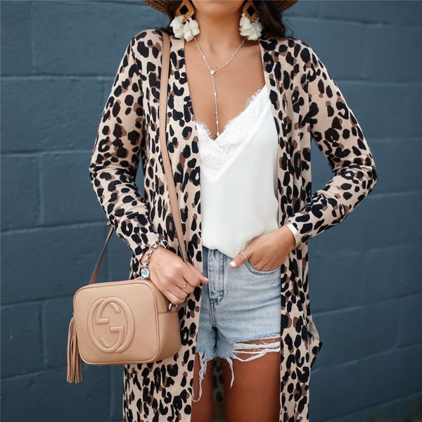 женщины с длинным рукавом кардиган tops casual leopard отпечатанных дряблая outwear trench кардиганы пальто, Tan;black