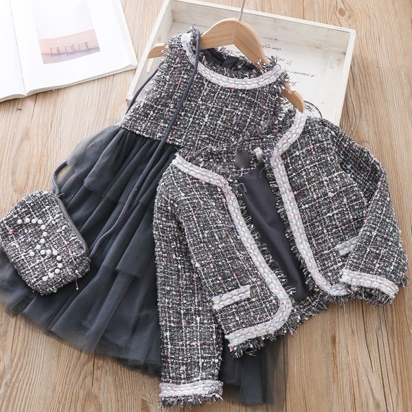 зима девушки мода комплект одежды детская куртка сумка платье 3 шт. костюм для ребенка клетчатое пальто наряд осень дети довольно ткани y200, White