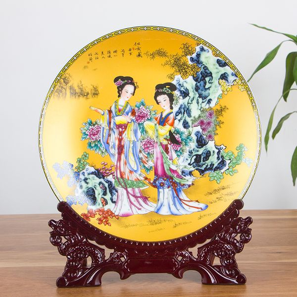 chinese style ancient beauty ceramic ornamental plate decoration round porcelain plate wooden base set wedding gift