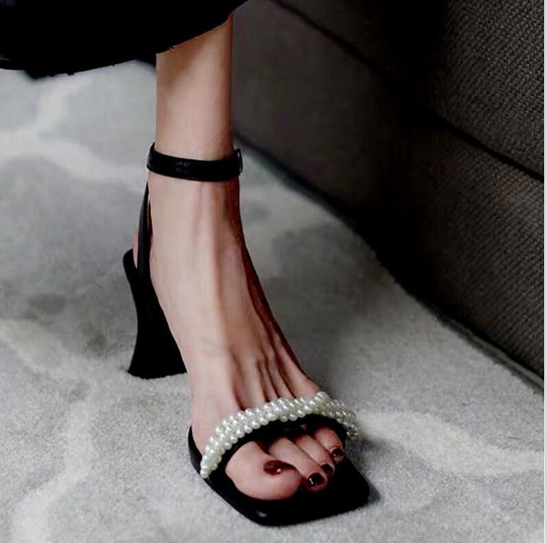 women's Summer slippers sexy Hollow cool classic fashion design Luxury rhinestone pearl wedding business Celebrity high Thick heel square shoes, Black