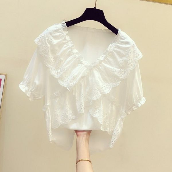 кружева оборок лоскутных женщины блузки 2020 лета новых v-образный вырез с короткими рукавами свободных леди элегантных пальто тянут устарев, White