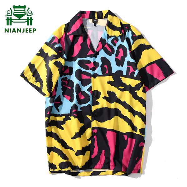 леопардовый принт тропическая рубашка мужчины отложной воротник улица хип-хоп короткие sleev рубашки мужской бренд harajuku уличная мужская, White;black