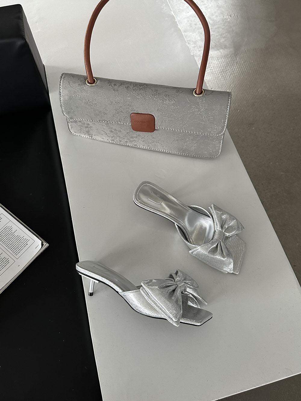 мода Дизайн с бантом Женские сандалии Шлепанцы Тапочки Черный Розовый Серебряный Лето Уличная обувь Мюли Туфли Тонкие туфли на среднем каблуке Вечерние туфли-лодочки Повседневное платье 39 7.5 серебряный