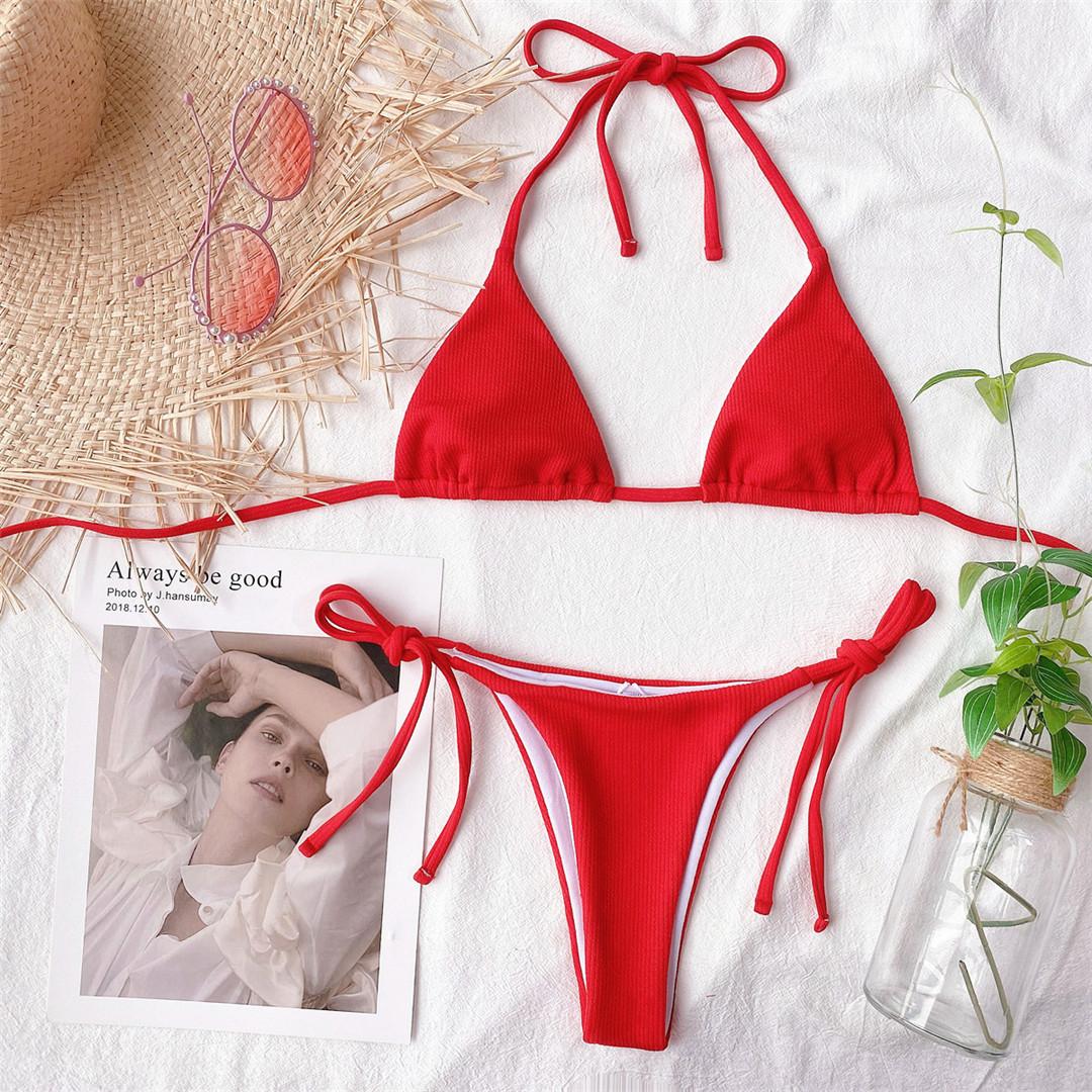 мода сексуальный ребристый бретелька через шею бикини женский купальник женский купальник из двух частей бикини комплект стринги купальный костюм S красный