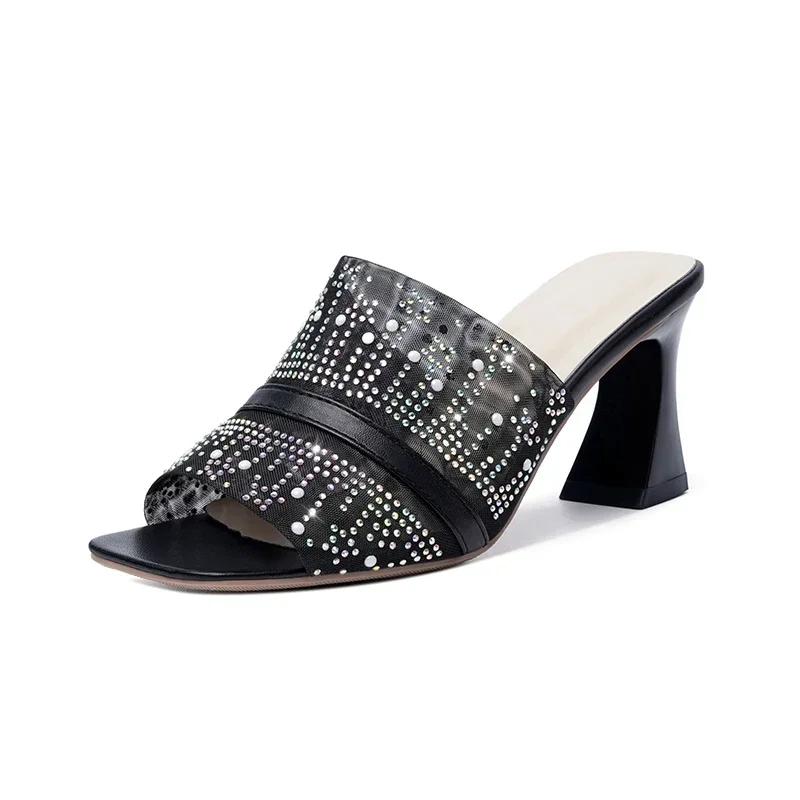 мода 2024 Лето Женские тапочки Высокие каблуки Туфли-лодочки Шикарные тапочки с открытым носком Слайды Кристалл Золотые Прозрачные Свадебные 40 чёрный