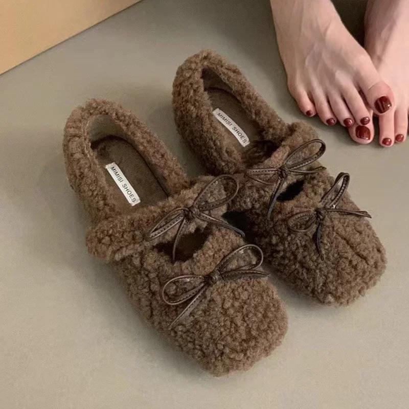 мода Bow Fur Square Toe Женские мокасины Плоские теплые туфли Женские 2024 Трендовые дизайнерские плюшевые зимние ботинки Зимние повседневные туфли на танкетке Zapatos Mujer 40 коричневый