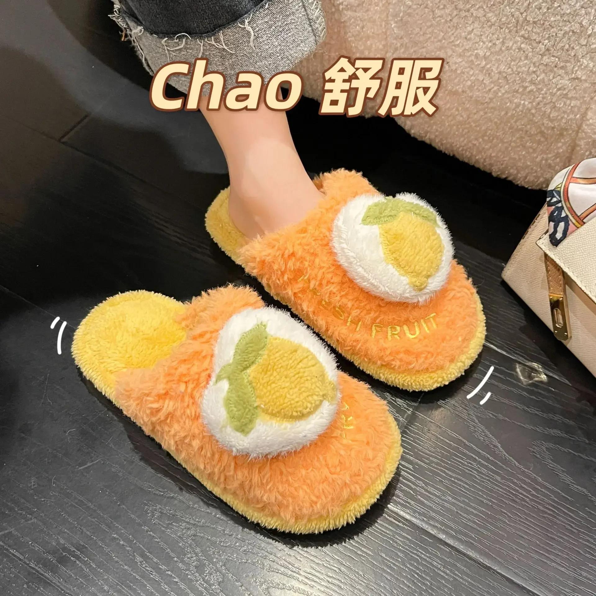 модная зимняя женская обувь милая мультяшная повседневная домашняя обувь с фруктами пушистая толстая теплая плюшевая обувь плоская повседневная домашняя удобная тапочка 44-45 оранжевый