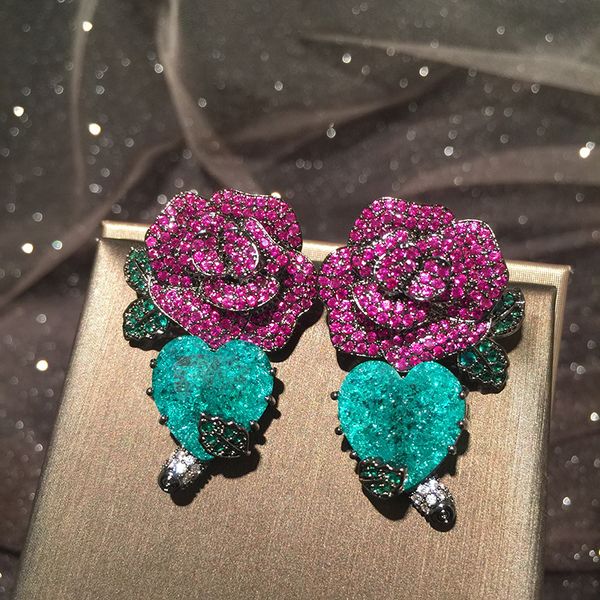 моды зеленых листьев сердце и красный цветок роскошных серьги для женщин, Silver