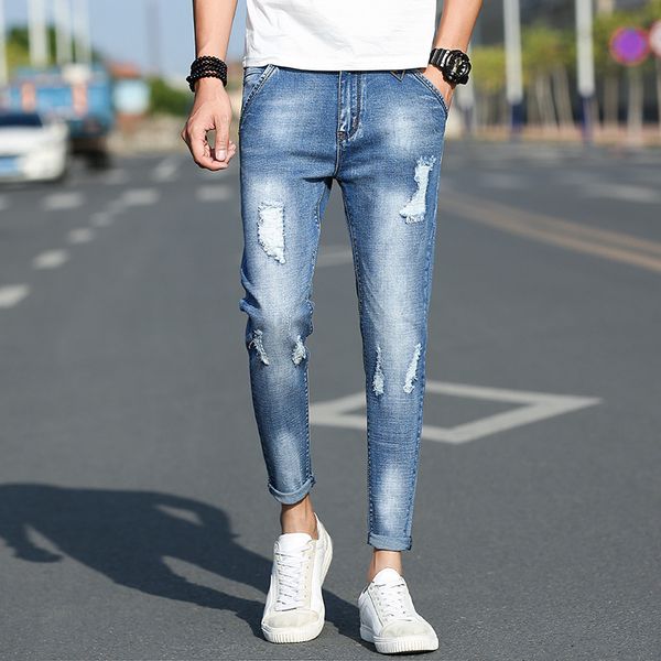 men's slim casual jeans boys hole light blue feet pants online shop tide pants
