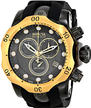 Кварцевый хронограф. Водостойкость WR 1000. Часы, минуты, секунды, дата, секундомер, хронограф. Люминесцентные стрелки и метки. Корпус выполнен из нержавеющей стали c IP покрытием. Диаметр корпуса 53.7 мм. Завинчивающаяся задняя крышка. Вращающийся безель. Устойчивое к возникновению царапин закаленное минеральное стекло. Каучуковый ремешок.