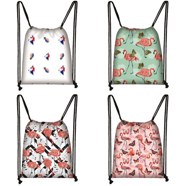 мультфильм фламинго печати drawstring сумка женщины дорожная сумка подросток школа коричневый девушка и мальчик рюкзак мода сумки для хранен