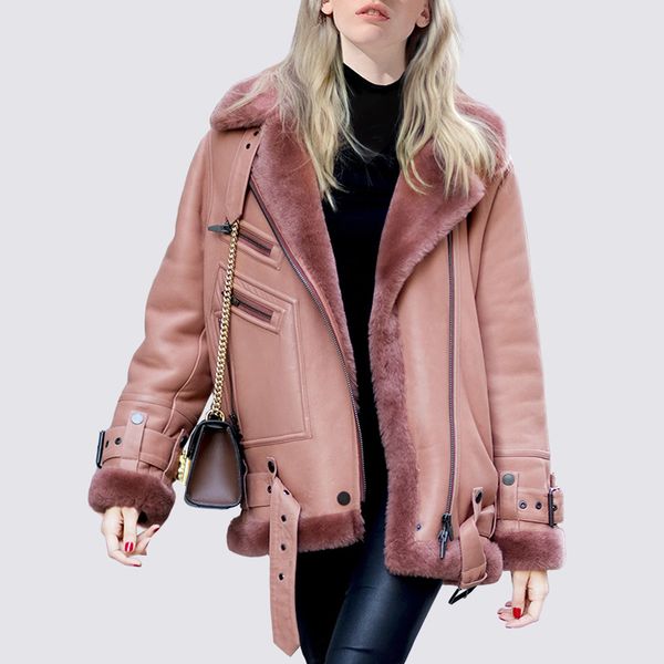 натуральный мех пальто женский 2019 зима новый короткий мотоцикл кожаная куртка розовый мех одно пальто куртка, Black