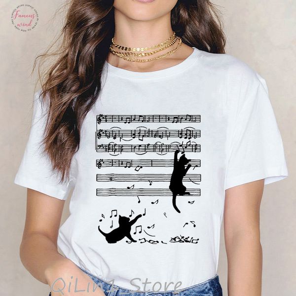 новизна музыка примечание black cat животные печать tshirt женщина harajuku kawaii одежда летний топ женский футболка tumblr graphic tees, White