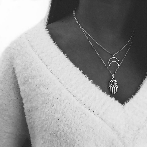 простой двойной слой луна рука ожерелья подвески для женщин старинные шарм серебряное колье ожерелье 2019 женские ювелирные изделия оптом, Silver