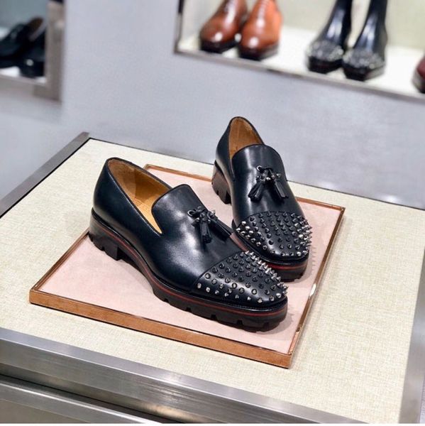самого лучшего качество gentleman red bottom одуванчик плоского шипы toe кисточка loafer квартира подкладка lug sole одуванчик оксфорд плать, Black