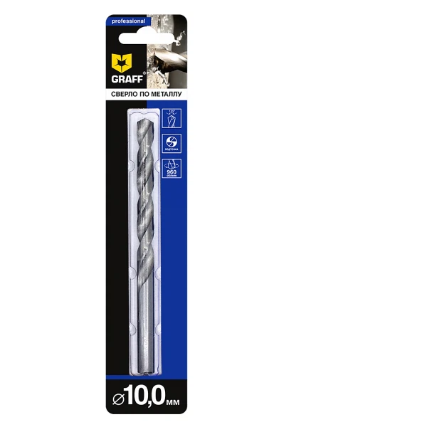 Сверло по металлу 10 мм GRAFF - средняя серия. Отличное сверло по металлу из быстрорежущей стали HSS 4341, изготовленное методом вальцевания (продольно винтовой прокат) c вышлифованной кромкой, класс точности В1. Угол при вершине 135 градусов и крестовая подточка обеспечивают отличное сверление металла без предварительного засверливания. Сверло изготовлено по ГОСТ 10902-77 (DIN 338) и предназначено для сверления отверстий в легированных и не легированных сталях, ковких и серых чугунах.Размер сверла: - 10x87x133 мм, где 10 мм - диаметр, - 87 мм рабочая длина, - 133 мм общая длина.Рекомендация по числу оборотов для сверла диаметром 10,0 мм - 960 об/мин. Обращаем ваше внимание, что скорость сверления указана для нелегированной стали. При обработке других видов металла число оборотов будет отличаться.