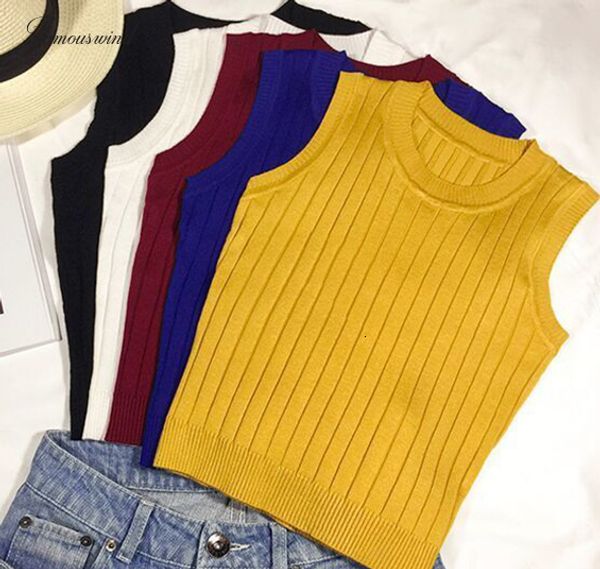 топы вязания лето женщин тонкий обрезанные женские многоуровневые вязаная camis рукава твердых футболки crop tops, White