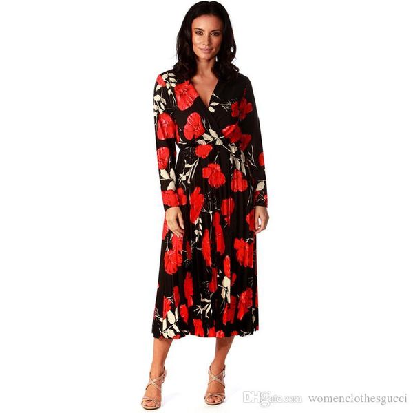 цветочные платья v образным вырезом с длинным рукавом повседневные платья мода плиссированные уличная женская одежда осень женская печать, Black;gray