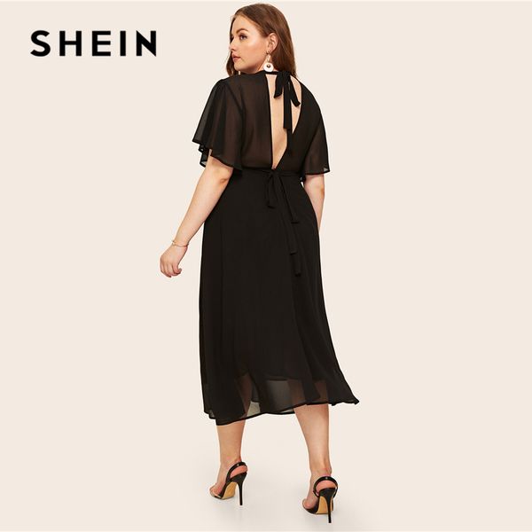 шеин плюс размер black tie назад флаттер рукава платья 2019 лета женщин элегантный стенд воротник высокой талии a line plus длинные платья, Black;pink
