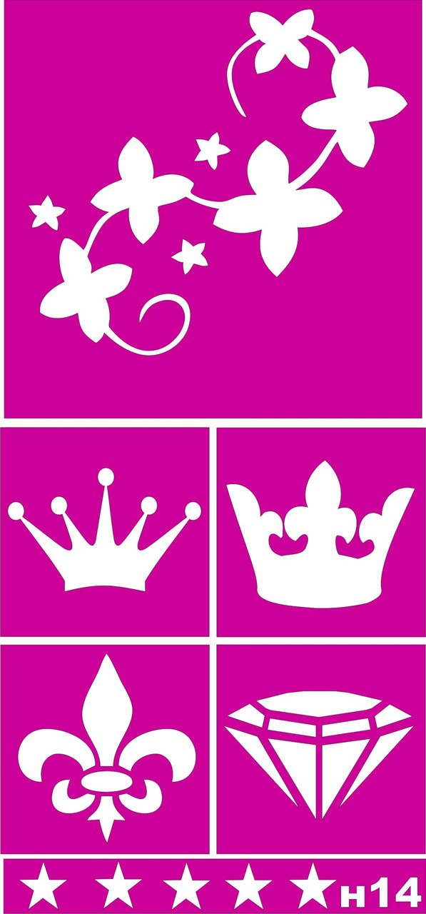 Это наборный трафарет в него входит 1 большой и 4 поменьше а также 5 звёзд .Трафарет - используется для нанесения временного тату. Материалы нанесения татуировки блестки краски или хна.На трафаретах есть "транспортная" пленка, которая поможет Вам перенести даже самый сложный рисунок с большим количеством деталей.