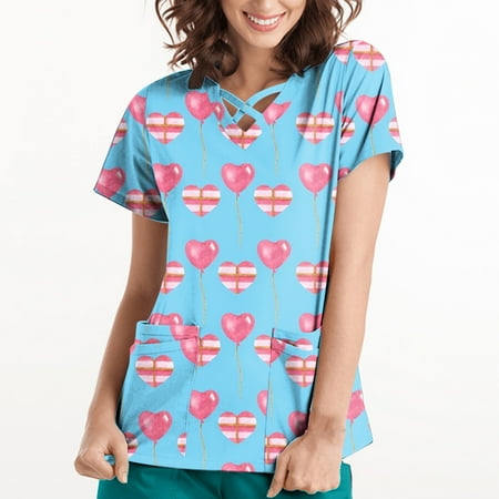 Winter Savings 2022! Women s Plus Size Valentine s Day Scrubs Tops Heart Print Working Uniform V-Neck Short Sleeve Casual Nurse Workwear Blouse Shirts with Pockets