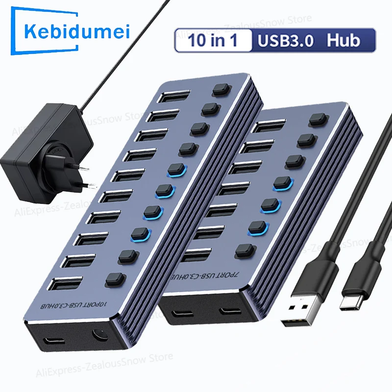 USB3.0 Hub, алюминиевый разветвитель портов 7/10, разделенный переключатель с переключателями включения/выключения, адаптер питания 12 В для мобильных телефонов Macbook, планшетов