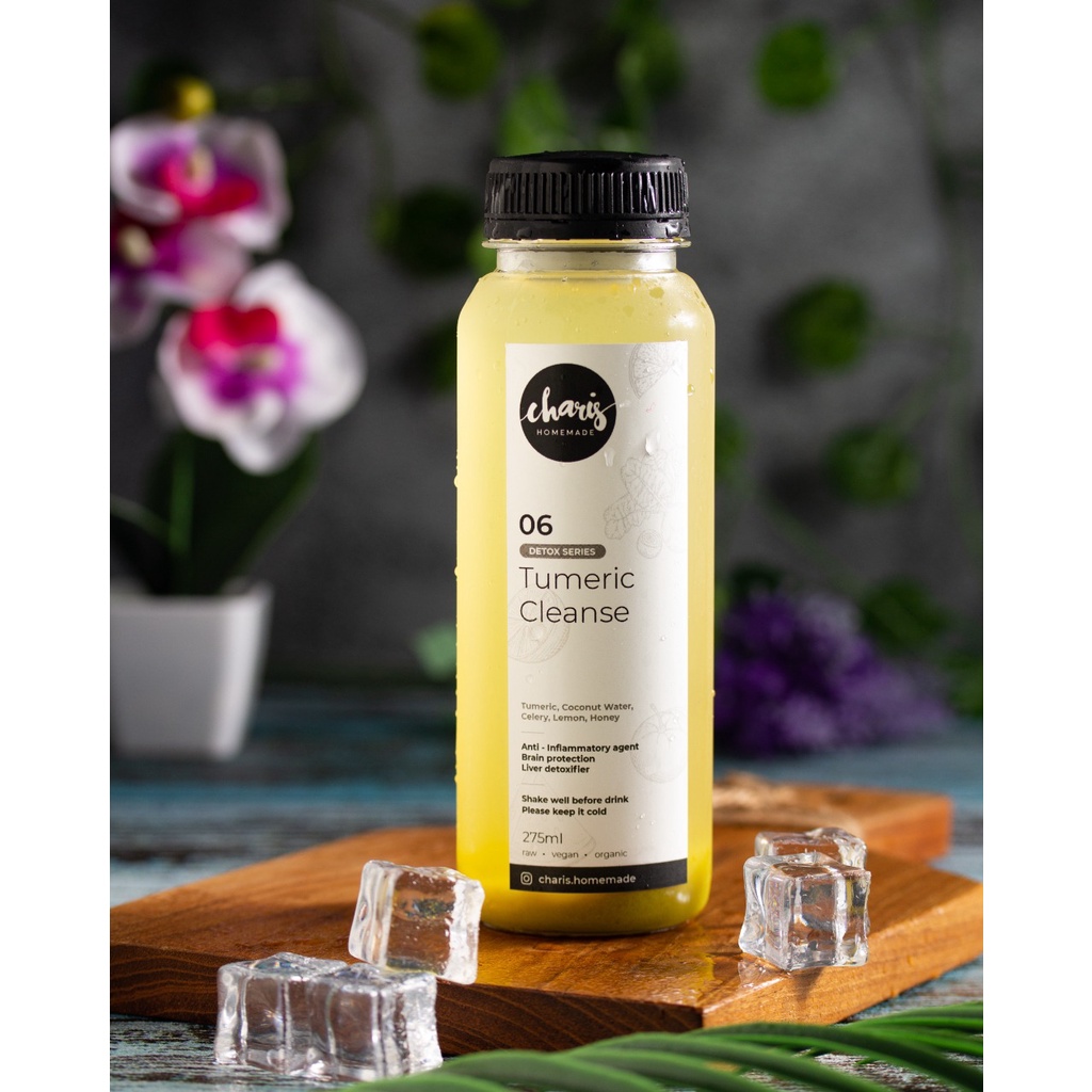 Cold pressed juice dengan menggunakan Kunyit, air kelapa, Seledri, Timun, Lemon dan Madu, rasanya menyegarkan dan sehat, tidak menggunakan gula dan bahan persevative lainnya