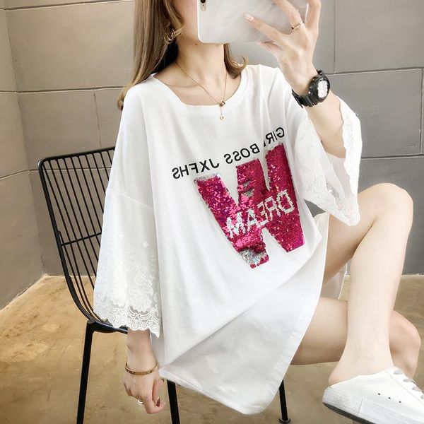 #0612 black white t shirt with sequins short sleeved long t-shirt for women loose cotton spliced lace shirts female summer women's