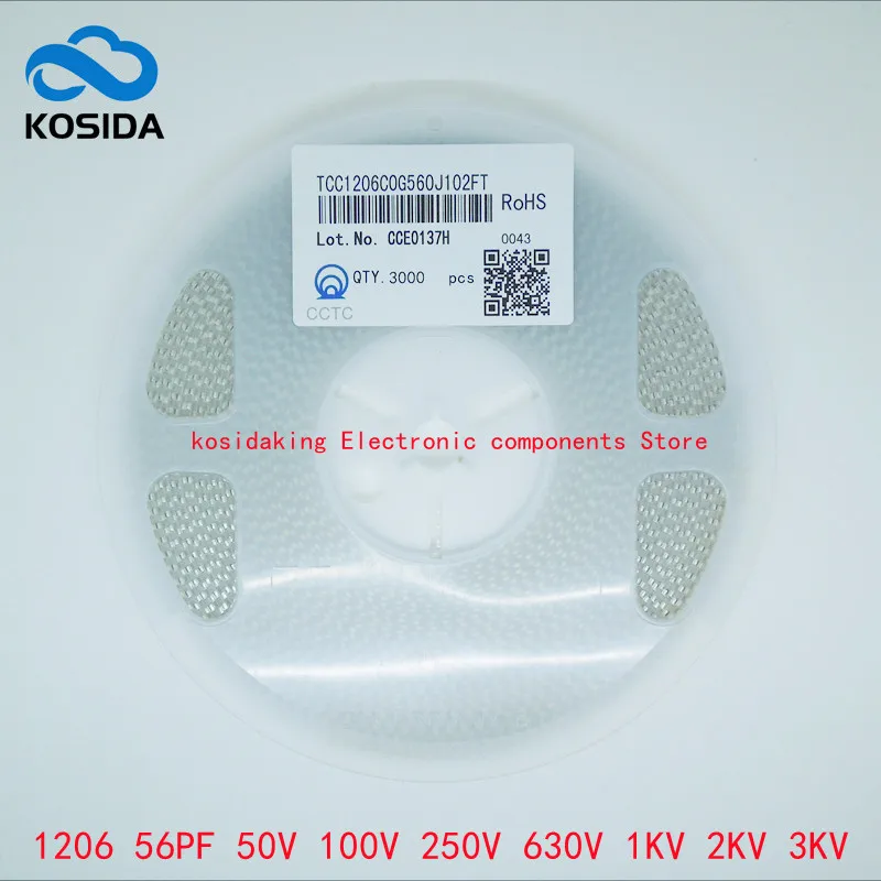 1 Катушка/лот 1206 3216 560J 56PF 5% NPO 50 в 100 в 250 в 630 в 1000 в 1 кв 2000 в 2 кВ 3000 в 3 кВ высоковольтные керамические конденсаторы SMD